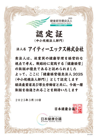 アイティーエックスでは、社員の心身の健康を重要な経営課題と捉え、健康経営を具体的に推進するために「健康経営宣言」を制定いたしました。